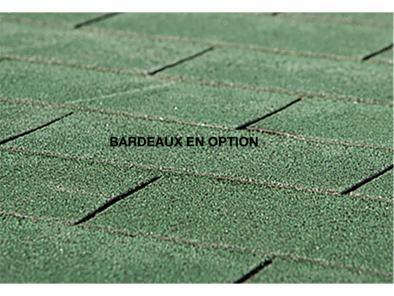 Accessoires : bardeaux en formats rectangulaires / écailles, coloris : anthracite, rouge ou vert vintage) + kit de gouttières, disponibles via l’onglet "Accessoires"