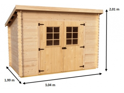 Ses dimensions extérieures au sol proposent une largeur de 300 cm pour une profondeur de 184 cm. La hauteur de la paroi arrière est de 165 cm et celle du faitage de 200 cm. La surface utile à l'intérieur est de 4,59 m², ce qui permet d'entrposer de nombreux équipements.