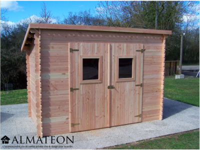 Cette porte est verrouillable pour protéger vos équipements à l'intérieur de l'abri. Cet abri est fabriqué en France et sa structure est en bois douglas. Une couverture en feutre bitumé, couleur foncé est présente sur le toit.