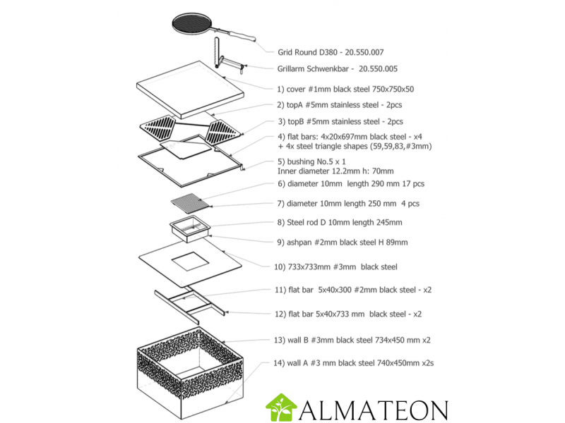 Brasero Barbecue Plancha CUBE en acier, dimensions 75 x 75 x 100 cm. Grille, broche et bras inclus, FEU DU JARDIN