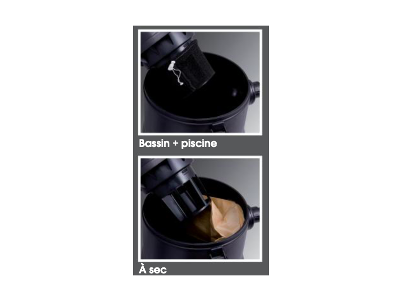 Nettoyage piscines et bassins : Arrêt automatique lorsque le conteneur est plein (interrupteur sur II), Redémarrage automatique (interrupteur sur II), Moteur sur le bloc moteur ON/OFF.