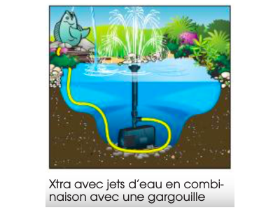 Pompe de bassin XTRA 350 LV conçue pour jeux d'eaux et filtres. Dimensions pompe sans buse (H x l x L) : 6 x 8 x 4,5 cm