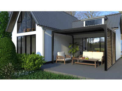 Pergola bioclimatique imitation bois 10,80 m2 et ventelles aluminium mobiles pour côté 3 m HABRITA