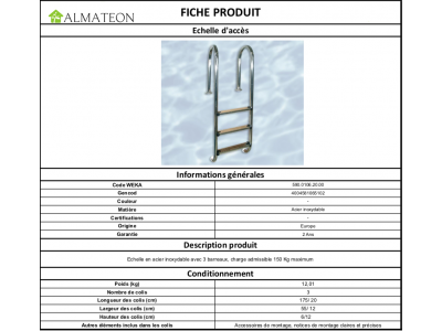 ALMATEON vous offre la possibilité d'installer une échelle d'intérieur à votre piscine hors-sol. Elle vous ganrantie un accès sans problème pour se baigner avec plaisir. Grâce à son exécution en acier, l’échelle attire les regards aussi par son aspect visuel. L'échelle d'intérieure est parfaitement compatible aux piscines PHILIPPINES, BALI, BAHAMAS et SEYCHELLES. Attention, nous vous recommandons fortement d'utiliser cette échelle sous surveillance directe d'adultes. Nous vous rappelons également que votre piscine privée est à usage domestique et non collectif ! L'échelle d'intérieure est garantie 2 ans et fabriquée en Europe et accessible à tous pour une charge maximale de 150kg.
