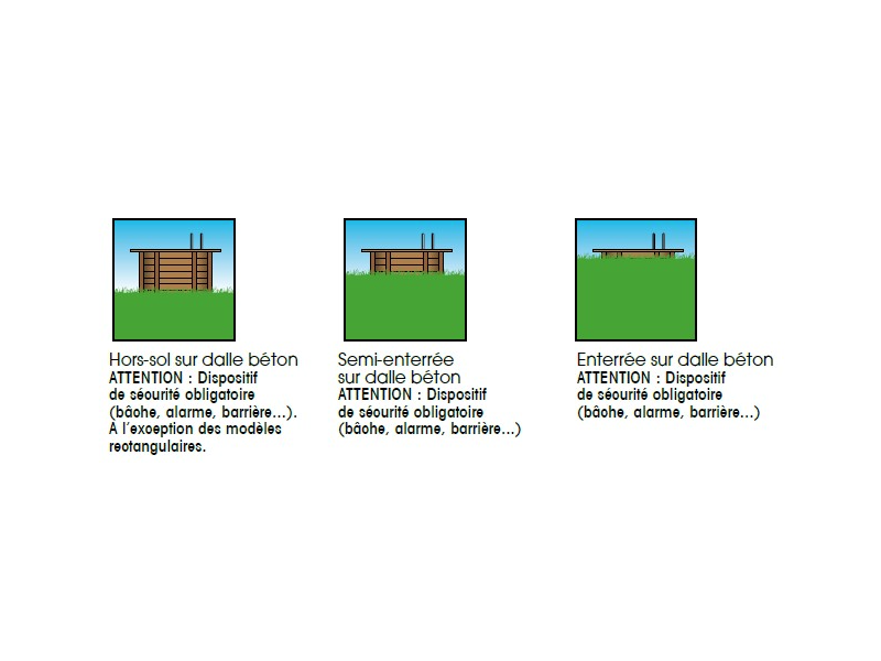 - Le dispositif de sécurité obligatoire pour une piscine semi-enterré sur dalle béton est d'installer une alarme , bâche et barrière...).