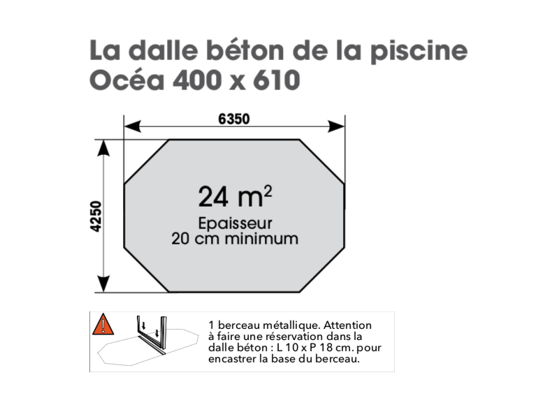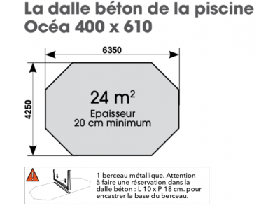 Pour une installation parfaite de la piscine Océa 400 x 610, une dalle de béton de 20 cm d'épaisseur est indispensable. Elle permet de maintenir le bassin stable années après années. De plus, un berceau métallique est situé au milieu des piscines octogonales longues.